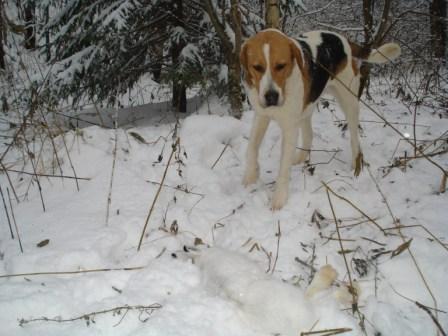 | В воскресенье был на охоте, погода просто чудо! Свежая порошка, тишина, температура -5. Взял с собой Пройду и Разгона. Первого подняли быстро, гоняли минут 40. Гон был яркий и пристальный. Взял зайца, удовольствие получил огромное. Попил чайку, потом подняли второго. Заяц ходил широко, подстоять не смог, был один. Выжловку снял в 22.30, оттрубив губы и сорвав горло.