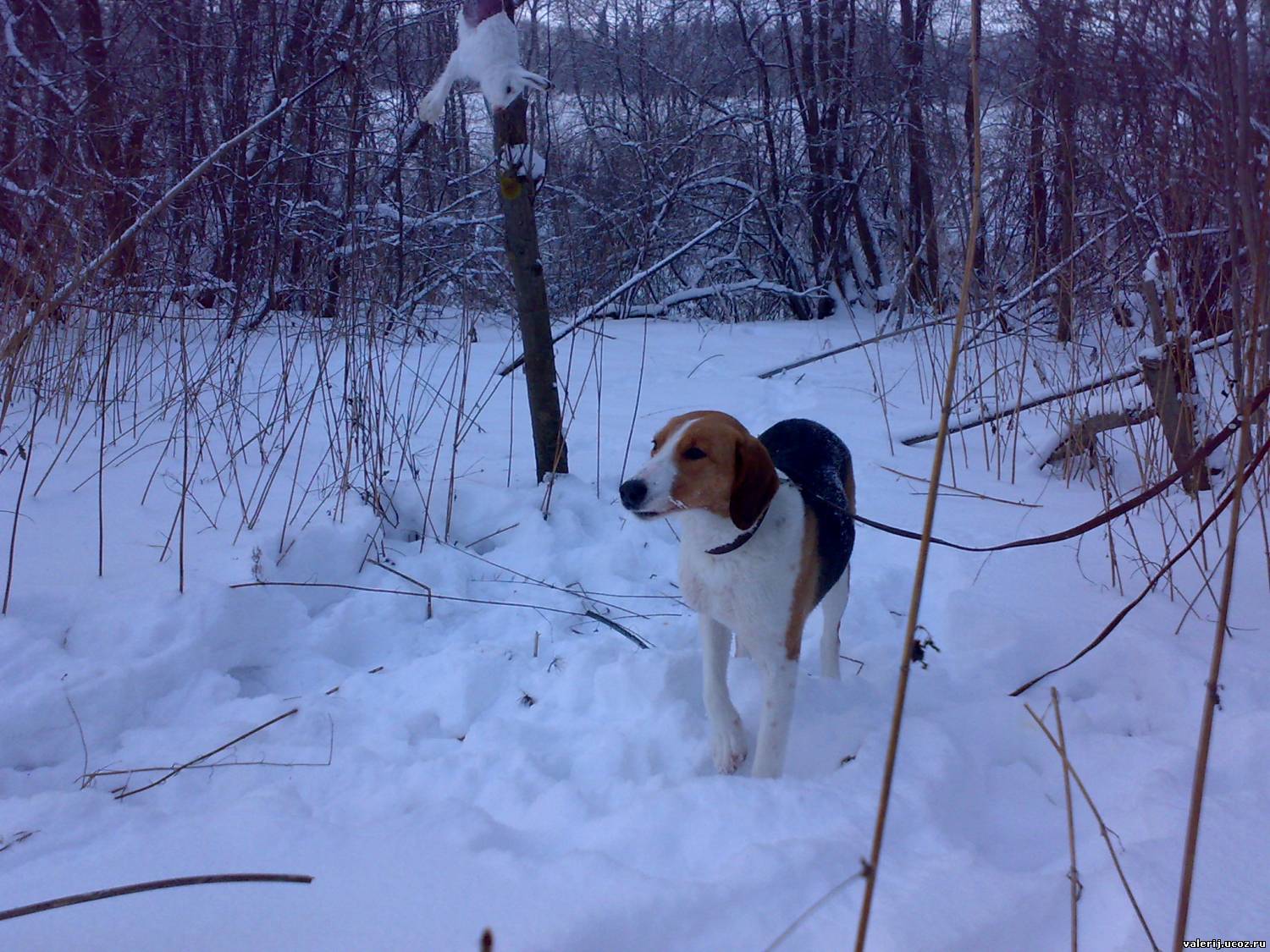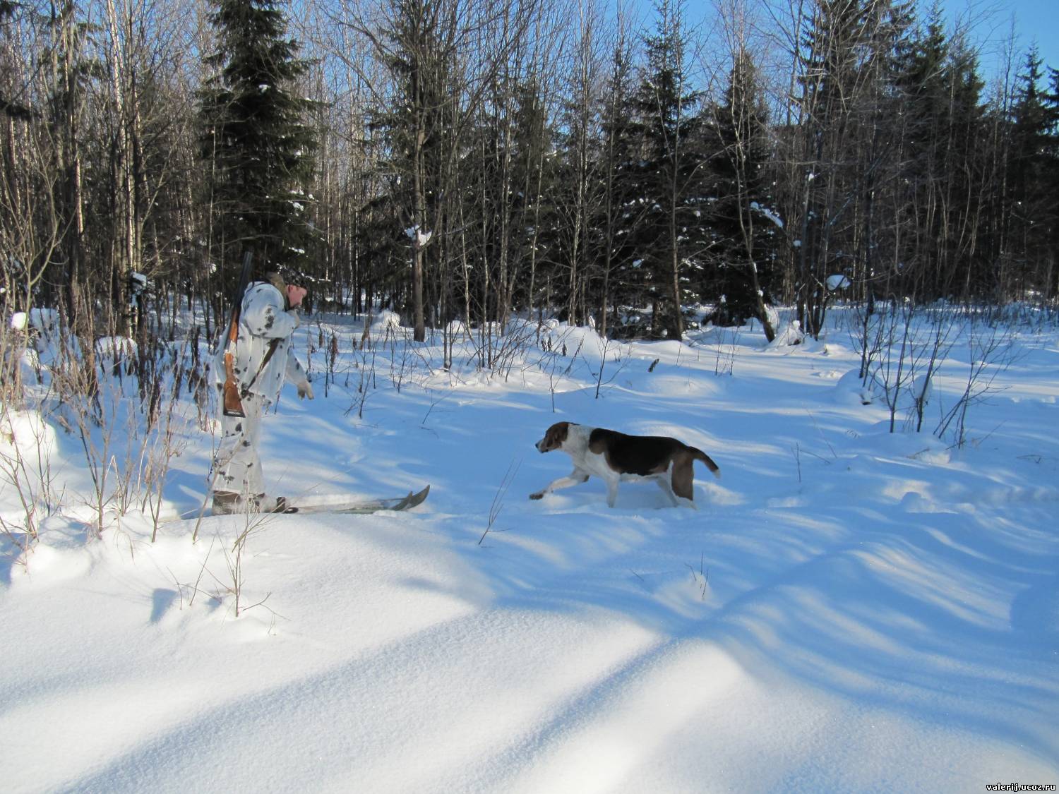 Привет гончатники! Как обычно на охоте, погода с утра -23, днём -17, ветра нет. Снега местами сантиметров тридцать. Собака гоняет полными ногами, пороши свежей с месяц как не было. Зайцы весь лес истоптали, но собаки работают, со сколами, перемолчками но до ружья.
